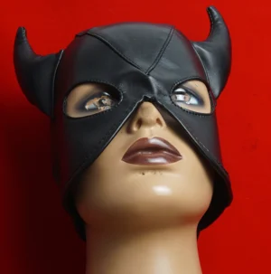 BDSM Mask PU Leather Open Eyes and Mouth,Slave Hood With Horns,Sex Toys for Couples,Bondage,Restraints,Adult Games,Roleplaying